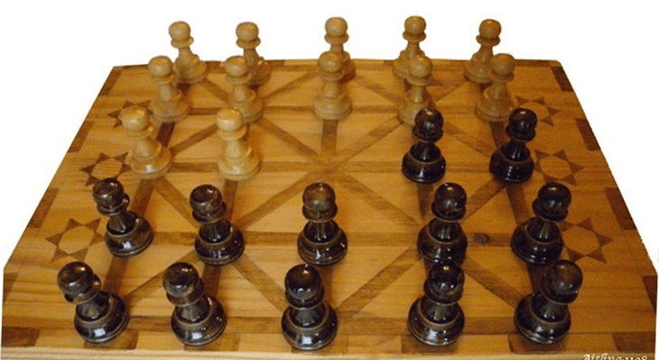 Испанец, для которого шашки были больше, чем приятным времяпрепровождением, играл в шашки с двумя разными вертикальными фигурами. См. табл. 12.3., гравюру из шашечной книги, написанной Джозефом Карлосом Гарсесом (Joseph Carlos Garcez 1684 г.). Гарсез усиленно занимался шашками, составляя эндшпили с простыми и дамками. Композиция требует много ума. Это может быть объяснением маленьких фигур в форме пешки и более крупных фигур, как слон, в шахматах.
