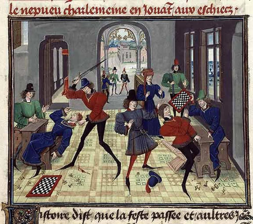 В некоторых случаях спецификация допускает интерпретацию, как, например, произошло в 1392 году. В этом году судебные приставы из двух деревень на севере Франции вызвали граждан, провинившихся во время игры в “мерель”. Судебный пристав, у которого был свой кабинет в ратуше или деревенском трактире, выслеживал нарушителей закона и готовил заседания, собирая доказательства. “Мерель”, это были шашки или мельница? Судебные приставы изменили ситуацию, добавив, что “мерель” считается игрой с игральными костями, то есть мельница. Это было обоюдное зло, эти ссоры во время игры, как мы читаем в средневековой литературе. См. табл. 1, где рыцари стучат друг о друга доской из 64 клеток.
