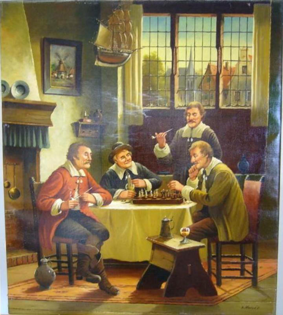 The phenomenon induces a question: did these chess players possess a chess board? At least half a century ago in the Netherlands historical materialism split off from history science, i.e. research into household goods, included the gaming board, so included chess boards. In the Dutch context this is possible because the chess board with its 64 squares differs from the draughts board with its 100 squares. In France, Great Britain and Germany such research does hardly exist. But even if it will be set up, there is the problem that draughts and chess are played on the same 64 squares board.