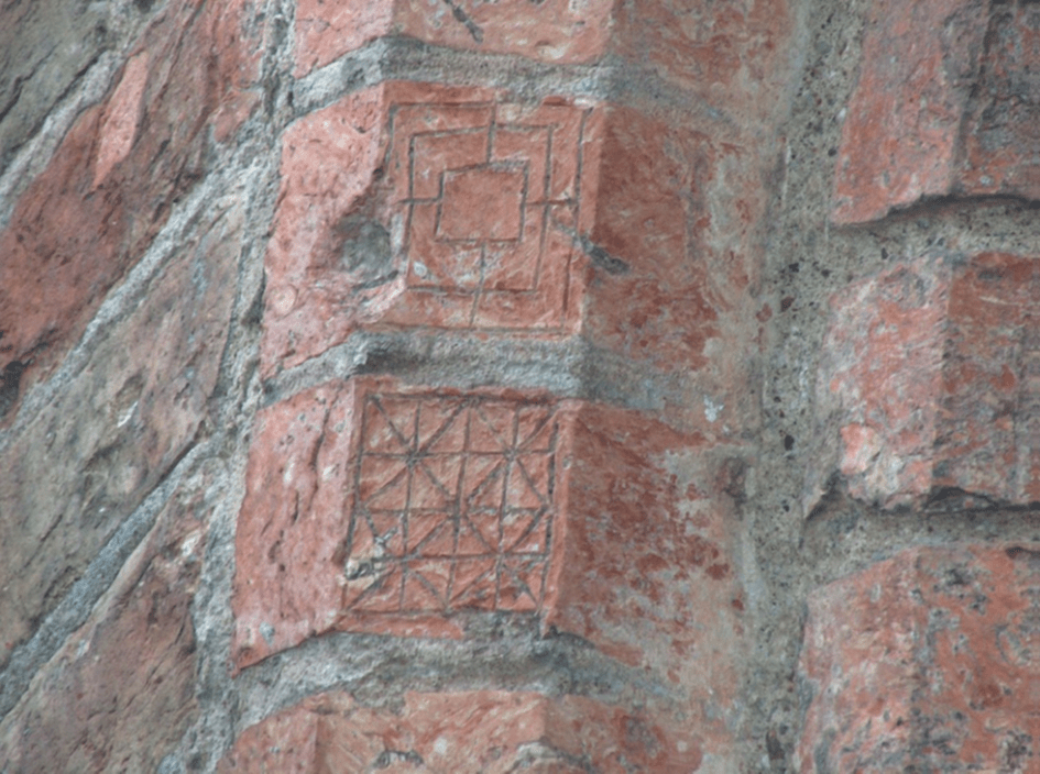 Alquerque bord en molenbord in verticale positie, ingekrast in twee stenen van een gewelf in het vroegere klooster van de Cisterciënzer monniken